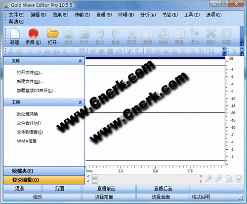 Gold Wave Editor Pro是一个功能强大的音频编辑工具,Gold Wave Editor Pro可以将录音带、唱片、现场表演、互联网广播、电视、 dvd 、或其他任何声源保存到磁盘上;Gold Wave Editor使用方便,可以对音频进行过滤和编辑。Gold Wave Editor Pro所支持的音频格式:未压缩的WAV PCM、压缩的WAV(GSM、ADPCM、DSP、U-Law、A-Law及其他)、MP3、MP2、WMA、Ogg、AIFF、AU、MPC、VOX、RAW、G.726、G.723、G.721。