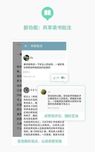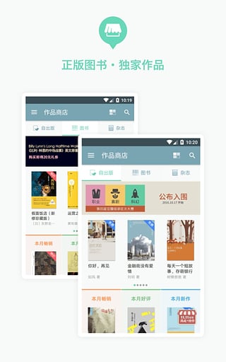 阅读:精致的书籍内容排版,支持在阅读中批注、划线、添加书签,免费试读所有作品,可下载作品到本地,随时离线阅读,可在多个设备间实时同步。