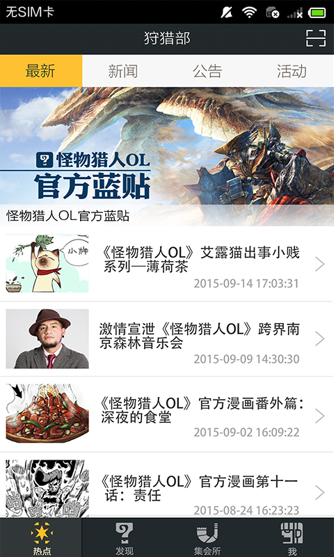 掌上狩猎部是《怪物猎人OL》的移动端应用,承载猎人玩家交互平台的重担,成为怪物猎人IP下重要的信息、活动、福利和攻略分发平台,未来更将作为怪猎用户社交、分享的重要渠道。掌上狩猎部将承载关注怪猎的用户,形成会员机制,独有的狩魂积分体系,并享有兑换游戏相关物品和参与各种福利活动的唯一途径。使用“掌上狩猎部”不仅能获得第一手的狩猎资讯,还能够查询武器派生、怪物攻略等各种游戏资料。还有各种丰富的小任务和小活动将定期展开。【更新日志】