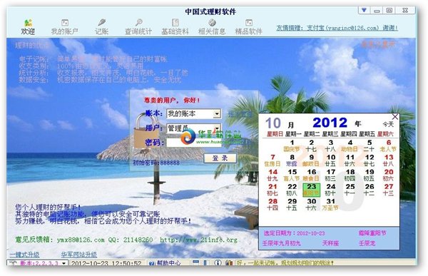 界面简洁美观,操作简单。里面包括我的账户,记账,查询统计,基础资料管理,以及理财资讯。可以把您的现金,工资卡,各种银行活期,定期储蓄,信用卡,股票资金卡,借出的户主,借来的户主,等等几十种财务账户,全部记录在此。把您平时的收入及支出情况,也记录进来,清楚知道每天,每月及每年的收支,以及每种收支类型,各占多少资金。整个财务的账目,就交给她帮您理清楚了。随时都知道现在的资金情况,应该收回哪些账户多少的资金,以及应该返还谁多少的资金。您是学生也好,白领也罢,或者是家庭户主,或者是个体老板,您都可以通过修改里面的默认收支科目,改成您最常用的收支科目,这样平时录入就会更方便一点。完全变成给您量身定做的个人银行一样,中国式理财软件,里面有丰富的查询统计功能,统计结果为表格或者图形展示,直观清晰。