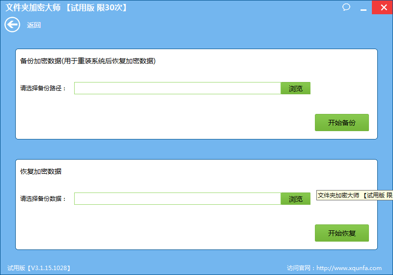 本软件还特有备份恢复功能,在您重装系统前,只需选择好备份地址将数据备份,系统重装完成后,您所有的使用文件夹加密大师加密过的文件可一键恢复到加密状态,无需再重新一一加密。