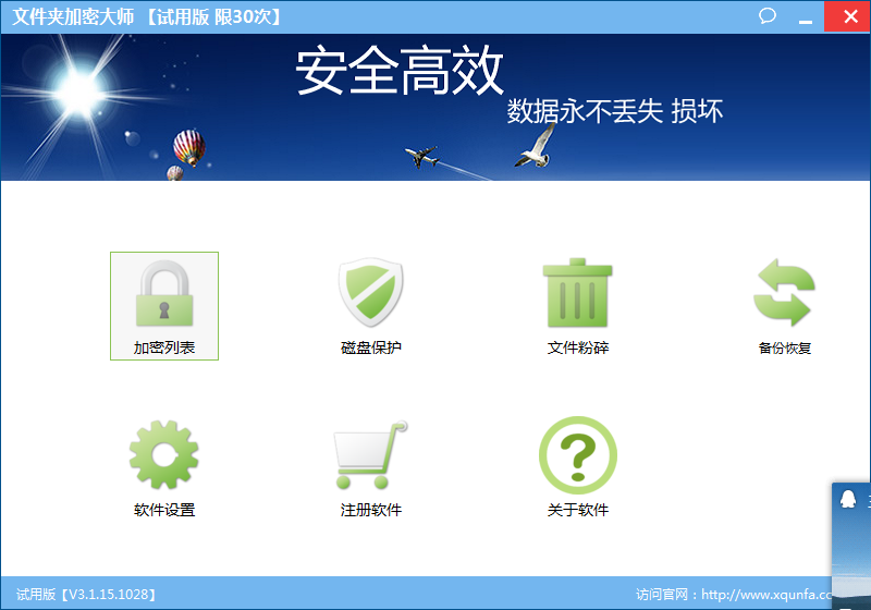 文件夹加密大师具有文件夹及文件加密,硬盘保护,硬盘隐藏,USB禁用,USB可读禁止写入,文件粉碎删除等功能,功能强大多样,瞬间加密,操作简单,用户还可自由卸载软件,我们保证您的数据永不丢失、损坏!软件可设置运行和卸载密码,他人无法操作,我的软件我做主!