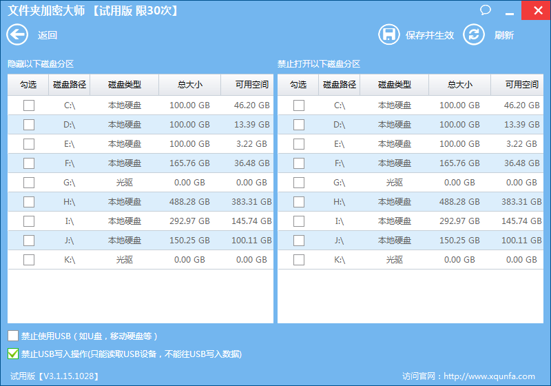 3、USB禁用和USB可读禁止写入功能:在磁盘保护功能下,勾选禁止使用USB或者禁止USB写入操作选项,即可完成对USB接口的限制。