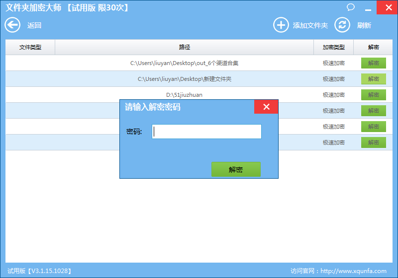 9、然后在加密列表中我们选择添加文件夹选择,在弹出的浏览文件夹中找到我们要加密的文件夹。