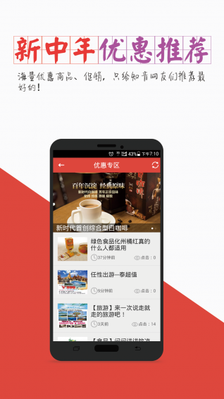 【优惠模块】为中老年朋友推荐所关心的促销产品,聚超值分享经验等。