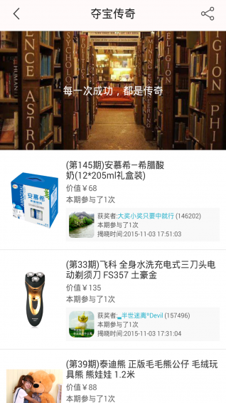 惠夺宝app是众筹网站与轻量级电商的结合,所有商品通过众筹的方式购买。只要一元就有机会获得你梦寐以求的潮流新品。【软件特色】