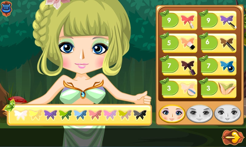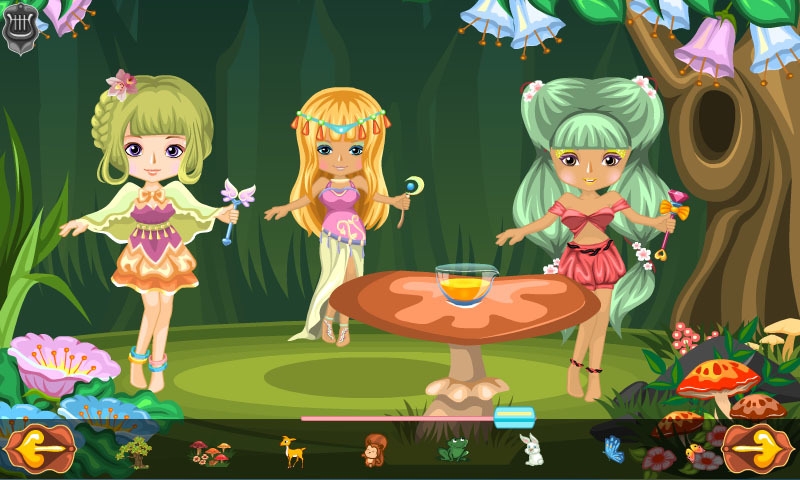 神秘的丛林里,住着三个美丽的精灵,又到她们聚会的日子了。精心装扮一下吧。第一步,化妆。唇彩、眼影、腮红、肤色,多种颜色任意选择。第二步,挑选漂亮的衣服和发型。别忘了还有精灵魔杖哦。第三步,选择聚会的背景。第四步,装饰一下聚会的地方吧。奇花异草,再加上些小动物。聚会就可以开始了。