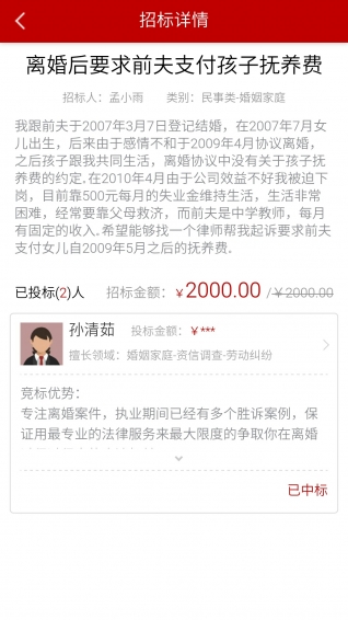 *招标:发布需求任务,律师竞标,委托合适律师进行服务。