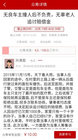 *众筹:提交需求,平台帮您筹钱打官司,通过应用可随时获取众筹动态。集体维权不再难,快速众筹很简单。