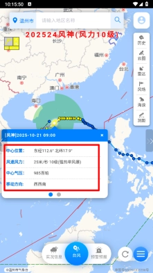 3、若点击台风所处位置,便能查看诸如风力、气压、移动方向等相关信息。