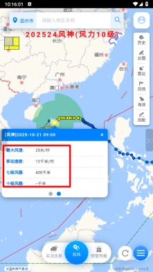 4、通过向左滑动,能够查看移动速度、最大风速、风圈等详细数据。