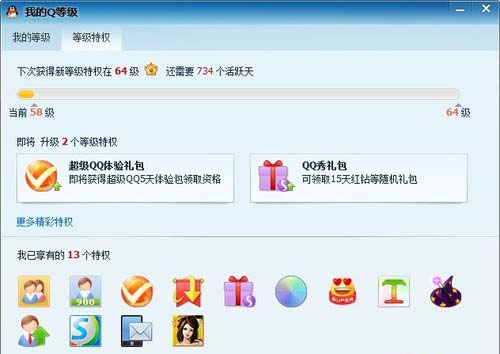 3、超级QQ体验特权。QQ等级从16级起每增加8级即可获得一个5天的超级QQ体验礼包。