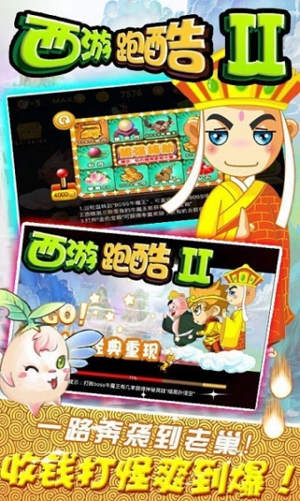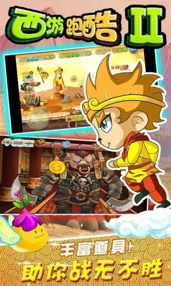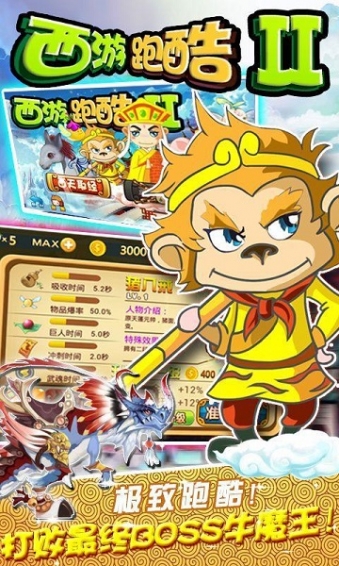 《西游跑酷2》是一款西游题材的动作跑酷游戏,经典的原版角色,齐全道具助你闯关,收金币打怪欢乐无限,与西游的四位小伙伴们一起奔跑起来。游戏提供了丰富的道具帮你打败各种妖怪,逃离各种的险境,合理利用道具让你战无不胜;同时你也可以通过收集路上的金币、材料,进行人物的升级和道具的购买,更有各种宠物坐骑武器将伴随你左右,陪你一起打败大BOSS,你还在等什么?一起来西游跑酷吧!