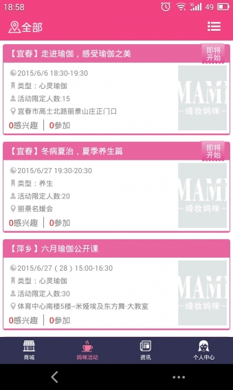 ● 妈咪活动:发布线下绮妆妈咪俱乐部同城活动信息,活动报名。
