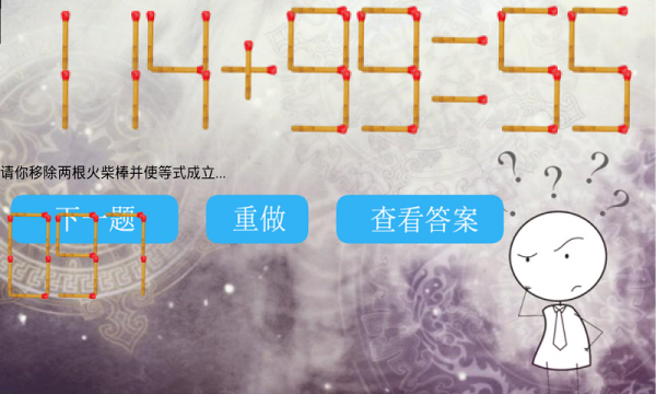 智力挑战游戏 v3.0 安卓版 智力挑战是一款十分有趣的休闲游戏,它共分为3个难度模式,分别为高级、中级、初级,玩家可以任意选择难度进入游戏,并将火柴移动到合适的位置,使等式成立即能完成过关条件。