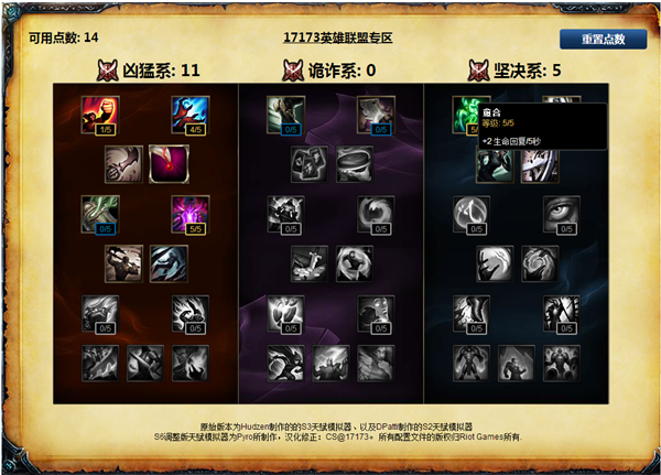 A:这个LOL天赋模拟器是最新的S6天赋加点,现在国服还没有更新哦~ 等到国服更新S6版本后,这个加点器的天赋就会跟游戏中的一模一样了。提前来考虑一下你在下个版本中应该如何选择天赋吧~