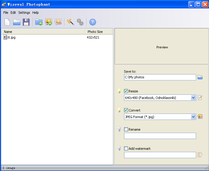 Wiseval Photophan是一个免费图像批量处理工具,可以调整批量调整图像尺寸,重命名和进行格式转换,支持各种常见图片格式!并且可以在调整的同时给图像添加水印!