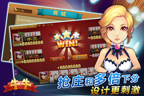 游戏流程:先发3张牌再抢庄,再选择加倍,再发2张牌。每局都可抢庄。加倍设定:根据庄家和自己的手气计算加倍倍率。