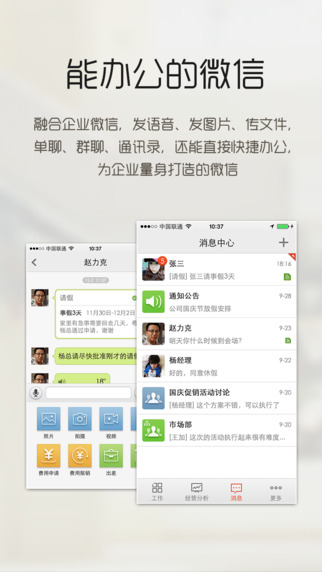 融合企业微信,发语音、发图片、传文件,单聊、群聊、通讯录,还能直接快捷办公,为企业量身打造的微信