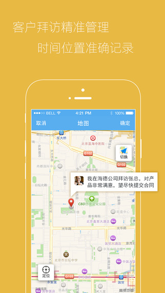 3、外部销售拜访管理困难:销售主动签到,上传照片、语音、文字、地理位置。通过提升拜访量,直接提高业绩。