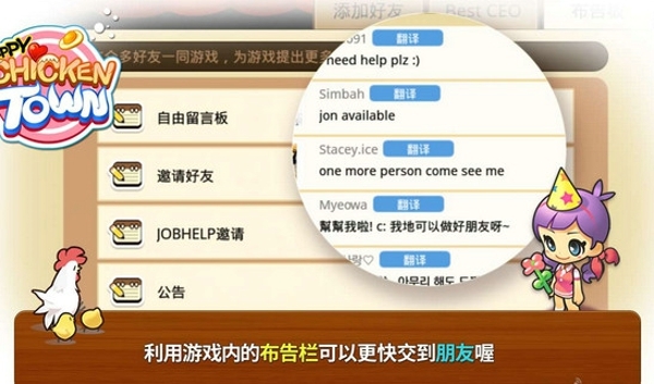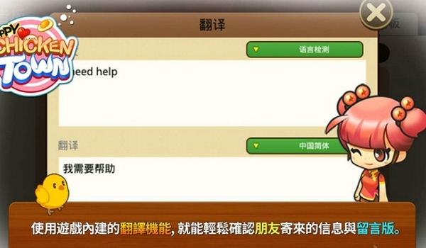 想跟全世界的玩家做朋友吗?《快乐的鸡镇》让你不懂外文也没关系!使用游戏内建的翻译机能,就能轻松确认朋友寄来的信息与留言版。
