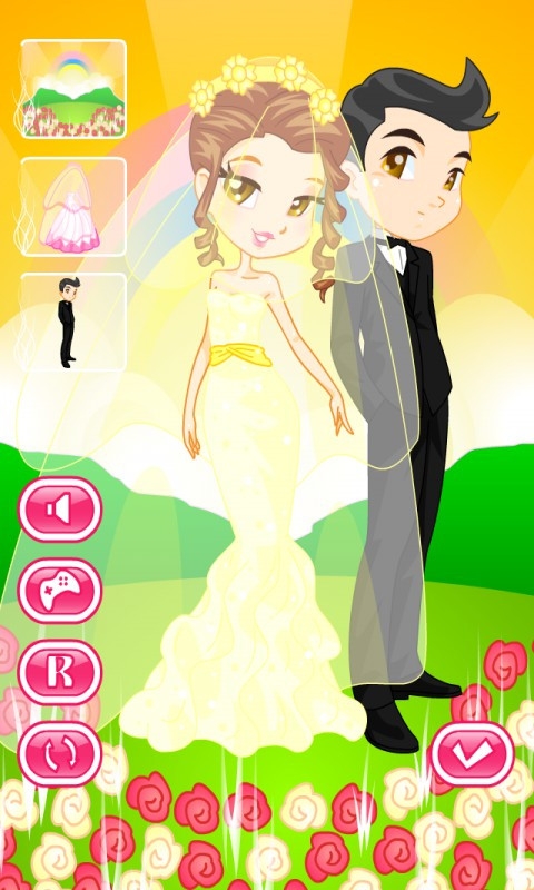 这是一个新娘换装类游戏。点击衣服图标的按钮可以直接切换衣服,其他的按钮可以切换其他的道具;“R”代表重置,让装扮回到开始的样子;旋转的箭头是“随机”,按了之后角色随机穿一套衣服和饰品;“勾勾”是展示你打扮好的角色,按下之后会隐藏掉其他的按钮;喇叭按钮可以关掉音乐。婚礼的钟声响了!仪式即将开始!唯一剩下的就是选择一个耀眼的童话般的裙子!但她似乎无法决定。那你还等什么?去帮助她!