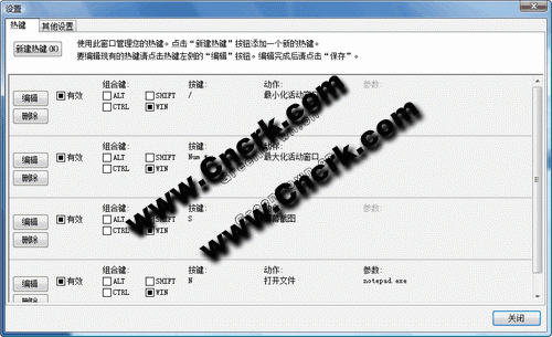 这个程序能使您很容易地建立您个人需要的热键。第一次启动程序时一个简单的指南将帮助您设置初始热键。在此之后,您可以在Windows的任何地方使用这个热键。你可以设置热键使窗口最小化,关闭正在运行的应用程序,打开一个文档,保存屏幕截图文件,退出Windows或发送击键到所有活动的窗口。