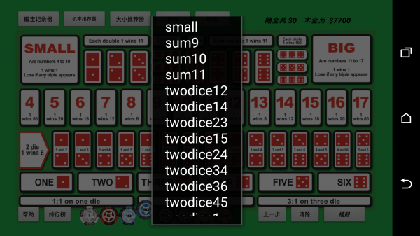 3.机率推荐器.当骰宝的事件很久没有发生时,机率推荐器便会推荐下注这骰宝事件.骰宝的某一种事件,累积了连续多次摇骰后仍然没有发生.当满足不大于此事件平均的发生机率时,机率推荐器便会推荐之.骰宝的事件包含:大或小,(不)特定三同号,特定两同号,数字总合,两个数字组合以及单一数字.