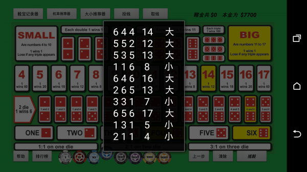 4.大小推荐器:此大小推荐器是作者根据传统连续加倍下注(连续下大or连续下小)改编而成.此大小推荐器在纪录摇骰10次之后,开始判断是否推荐玩家下注大还是小,并且显示推荐下注的數字.根据作者用大量点数做电脑分析,可以讓玩家满足在长时间玩骰宝的情况下,也可以享受欢乐骰宝的滋味.有兴趣的玩家可以尝试看看!
