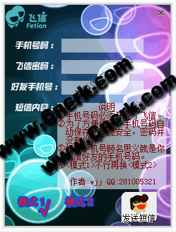 我只是调用了接口实现了短信发送,纯属娱乐!本工具无需下载第三方组件。下载即可使用了,方便上班、旅行、网吧等用户使用。 备:支持给自己发送短信,与飞信一样都是免费的,但不支持给不是飞信好友的手机号码发送短信。