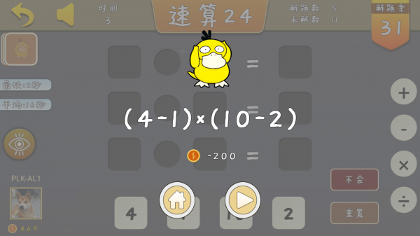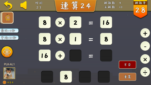 速算24是一种数学游戏,正如象棋、围棋一样是一种人们喜闻乐见的娱乐活动。它始于何年何月已无从考究,但它以自己独具的数学魅力和丰富的内涵正逐渐被越来越多的人们所接受。这种游戏方式简单易学,能健脑益智,致力于培养孩子口算和心算能力."速算24"的游戏内容如下:从1到10的数字中随机选择4个数字(可重复),用加、减、乘、除、括号把牌面上的数算成24。每张牌必须用一次且只能用一次。谁先算出来,就获胜了。