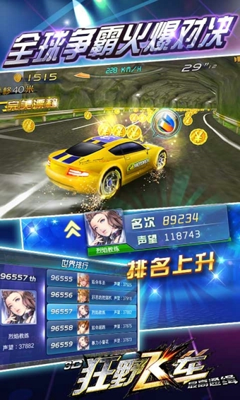主界面:选择改装按钮升级强化车辆,点击车辆左右方的箭头来切换车辆,界面上方夺宝可以消耗钱币来抽取新车,点击黄金赛来挑战新的模式,该模式主要为刷金币!选择出发进入竞赛画面,车辆自动前进,点击界面左右下方的箭头来控制车辆左右移动!