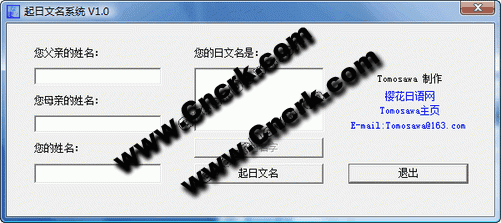 绿色软件,下载后直接解压缩后运行。本软件只是好玩,没有其他别的意义。使用的时候,输入父亲的名字,母亲的名字和你的名字,然后点“起日文名”按钮即可。