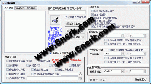 1.窗口管理。作为软件的主要功能,软件提供强大的窗口管理功能,可以对窗口进行隐藏、关闭、修改文字、图标等操作。其中隐藏功能又有热键隐藏、鼠标隐藏、标题栏按钮隐藏、自动隐藏等多种方式,还可设置为隐藏时关闭声音,全方位保护您的隐私。2.进程管理。软件除了列出系统当前的进程、显示详细路径外,还可以终止结束、隐藏大部分进程。进程隐藏后在任务管理器中不可见。3.托盘管理。在任务栏的右下角有一块托盘图标区域,软件提供了对于其中图标进行管理的功能,包括隐藏、修改、删除等,可有效改善托盘区拥挤的状况。该软件界面可以选择是否修改主页,请用户注意选择...