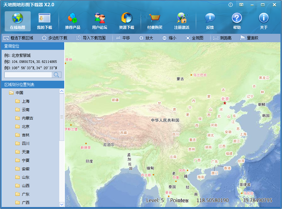 软件支持可视化新建任务,在主窗口中单击“在线地图浏览”标签切换到地图浏览窗口,单击工具栏上的“框选下载区域”按钮,在视图中绘出需要下载的范围选择框,然后在该选择框内双击鼠标即可开始新建任务。