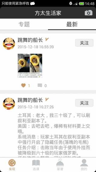2.发现界面有专题菜谱和最新界面类似朋友圈功能