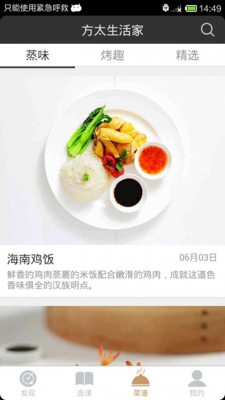 4.菜谱主界面有推广的蒸味、烤趣、精选菜谱