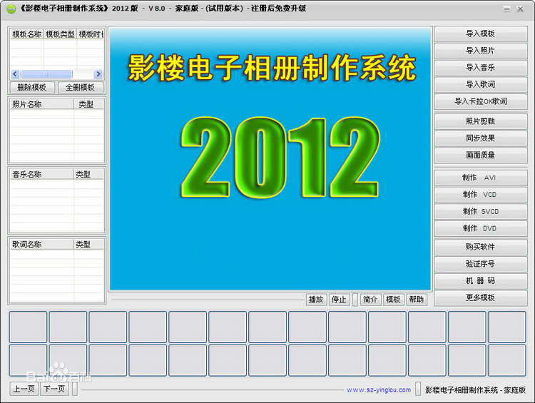 影楼电子相册制作系统是一款专业的电子相册制作软件,只要导入模板,导入照片,导入音乐,导入歌词,软件就会自动处理,自动分析,自动同步,自动匹配,所有的工作全部由软件自动完成,大量节省了时间。支持二种同步效果,可以随模板同步,也可以随音乐同步,支持画面质量设置,让用户在制作时有更多的选择。【】使用于影楼部门,数码部门,照相部门,摄影部门,旅游部门,学校,等等。