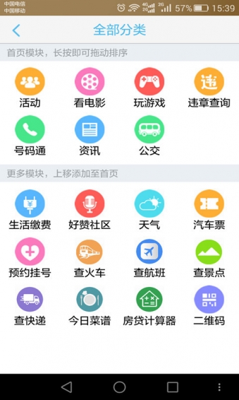 3,新增号码通,预约挂号,查火车,航班,景点,快递等便民模块