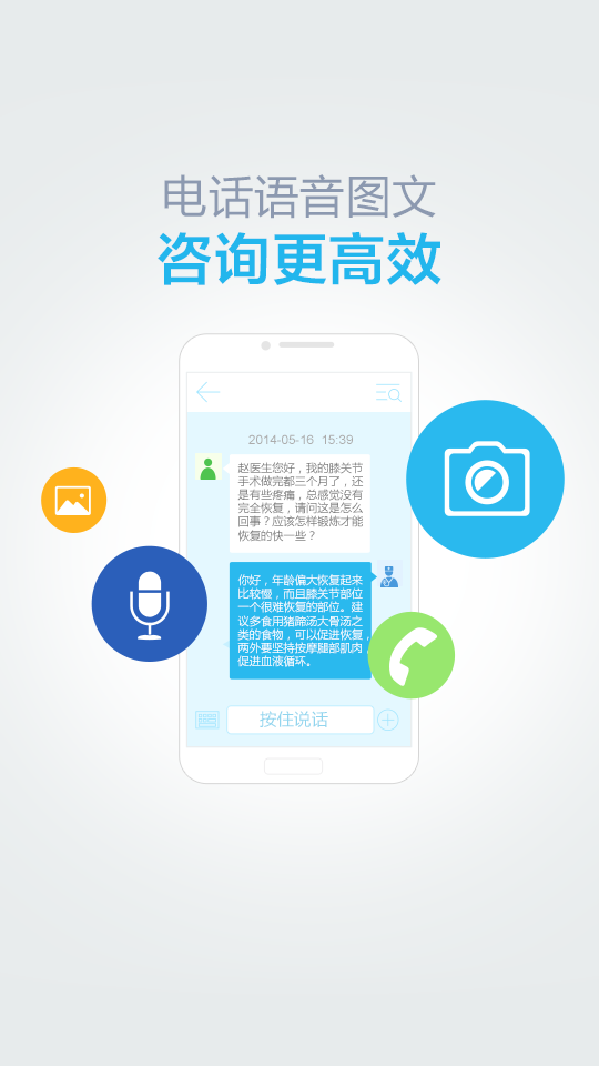 医生全程跟踪:为你治疗的医生有保障的连线我的医生,病了不再乱投医;咨询病情:多种咨询方式,文字、语音、图片、电话;