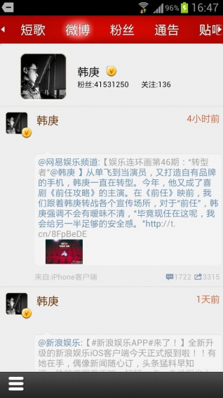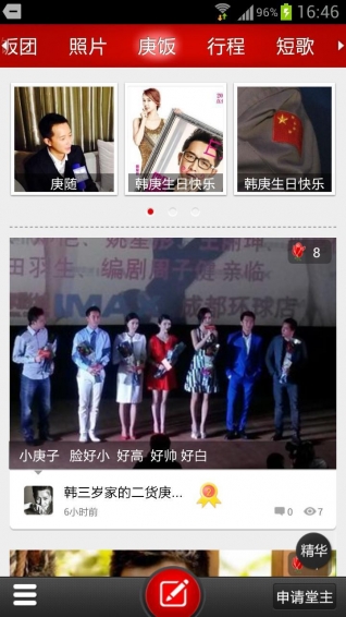 饭团韩庚app,专业的追星应用。用饭团韩庚app,随时查看韩庚最新动态,和喜爱韩庚的粉丝一起聊天,打榜,接机,找到志趣相同的好朋友。【软件特点】
