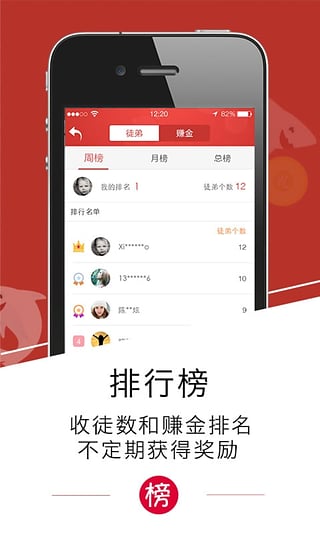 3、排行榜,收徒数和赚金排名不定期获得奖励
