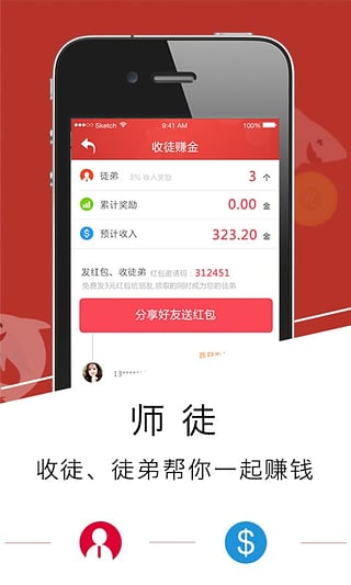 3、收徒模式:让徒弟来帮你赚钱,有礼替你发红包。让好友填写你的专属邀请码, 就可获得2元红包,之后就等着好友不断为你创收了。