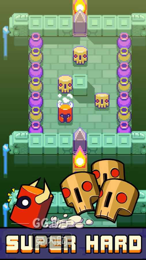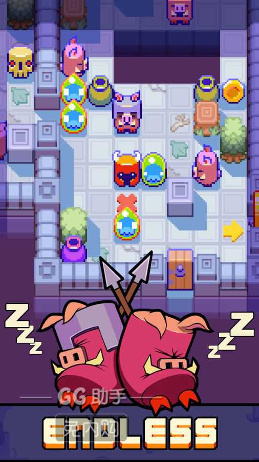 具体操作很简单,玩家通过上下左右划动屏幕控制主角行走,每行动一步,敌方的怪物也会相应的行动。不过敌方的怪物种类相当丰富,有史莱姆、铁甲猪、骷髅头等等,他们的行动方式也各不相同,例如史莱姆每两回合行动一次,铁甲猪调转攻击方向也需要消耗一回合。玩家需要把握敌人的特点,消灭它们,然后走向终点。游戏分为闯关与无尽两种模式,美中不足的是关卡只有10关,而无尽模式的场景则是随机生成,玩家每闯过一个场景得1分,最终的成绩可以与好友或其他玩家比一比。无尽模式中可以捡取金币,但小编没有发现可以消费的地方,也许Nitrome后续会增加可解锁的新角色?还是慢慢期待吧。