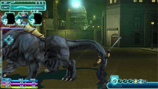 本作将采用全3D的方式构成游戏世界,游戏角色在3D场景中行动,战斗则是采用传统踩地雷方式,不过并不转换场景,而是直接于移动场景上展开。《最终幻想7危机核心》的战斗系统非常象《最终幻想12》的“实时多维战斗系统”(ActiveDimensionBattle,简称ADB),游戏中敌人都在大地图中显示,当玩家控制角色接近敌人的时候会直接进行战斗,中间没有切换非常的流畅。本作的战斗是在地图上直接进行并不切换画面。玩家需要一边控制扎克斯移动一边战斗,动作性是本作的最大特征。画面左上方的轮盘通过消耗“SP”来进行回转,轮盘根据转到的角色与数字来决定发动的效果。