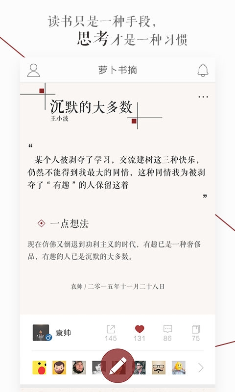 萝卜书摘是一款能够让人沉浸在文字的海洋的读书应用,这款软件会实时更新其他读书爱好者提供的书摘,并为每一位用户匹配阅读品位相似的读书人,一起分享读书的乐趣,让我们之间的思考之力碰撞,体验读书人之间的奇妙交流。
