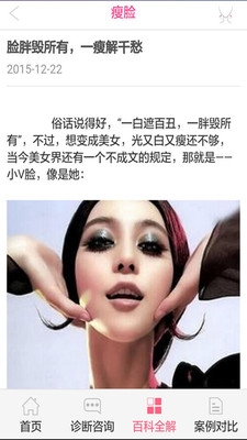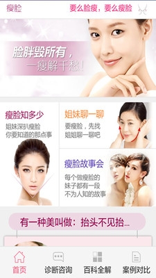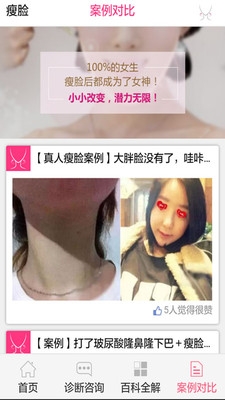 通过瘦脸APP,你可以了解瘦脸整形知识及如何瘦脸,如何打造瓜子脸V脸的全方位介绍,包括瘦脸百科,瘦脸问答,瘦脸医生在线咨询,瘦脸案例展示等等瘦脸相关的内容。