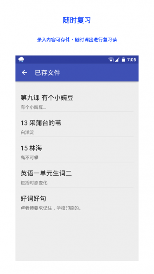 可以把录制的单词文件保存,并记录这次录制内容的描述,下次复习的时候,可以直接从已存文件中挑选出来直接用。不需要的文件可以在列表中删除,也可以修改文件的描述。