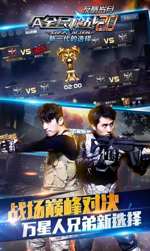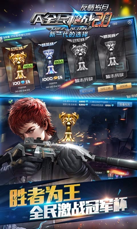 《全民枪战2.0》“冠军杯”玩法激爽上线!在“冠军杯”模式下,玩家无需组队,直接匹配即可参加争夺冠军杯战斗。在Solo阶段,每个小组排名靠前的符合条件的玩家晋级;在淘汰赛阶段,玩家按一定规则组成五人小队,连胜晋级,失败退赛!而冠军队伍所有成员都可获得冠军奖杯,玩家可参与不同等级的冠军杯,而“冠军杯”奖杯也将作为短期内获得的强而有力的实力证明而在玩家的个人页面获得公开展示!还在等什么?呼兄喊弟一起来争夺“冠军杯”吧!《全民枪战2.0》,新一代的选择!