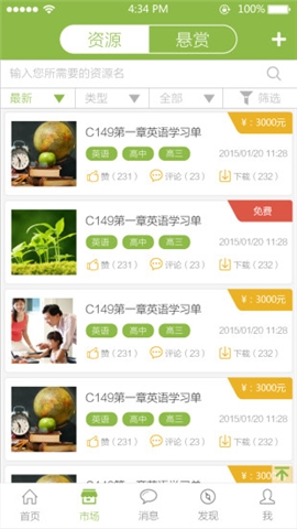 当家长或老师在资源市场上找不到自己需要的教学资源时,就可以发布悬赏,悬赏要写清楚自己的需求和悬赏价格,看到悬赏后,全国的教师都可以参与竞标,悬赏者对所有的竞标资源进行筛选,选最优稿件作为中标,中标者可以得到相应的中标金额。